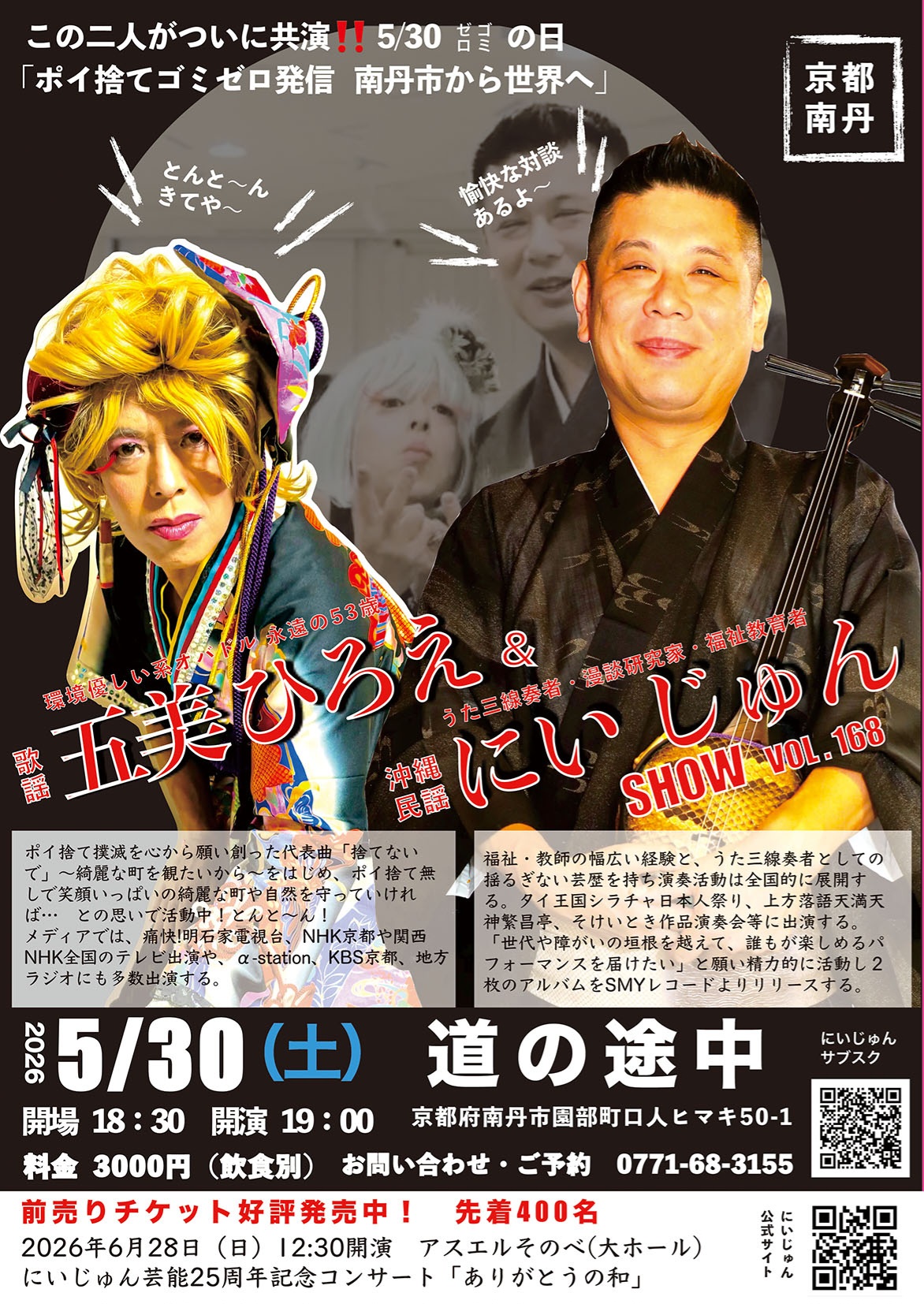 日時 2026年5月30日(土) 開場18時30分 開演19時00分 会場 道の途中 京都府南丹市園部町口人ヒマキ50−1 出演 にいじゅん(沖縄うた三線) 五美ひろえ(歌謡) 料金 3000円(飲食別) 中学生以下無料(要オーダー) お問い合わせ 0771ー68ー3155