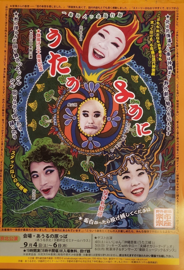 全国の津々浦々を旅しながら活躍され、旗揚げ30周年記念を迎える〔野外劇団 楽市楽座〕が、京都公演(9月4日(土)~6日(月))に京北・あうるの原っぱで野外劇を上演されます。僕は劇中に少しゲスト出演します。皆さまのご来場をお待ちしています。日時 9月4日(土)~6日(月)19時開演18時半開場会場 京北・あうるの原っぱ(京都府立ゼミナールハウス内)入場無料、投げ銭日替りゲスト9/4 にいじゅん(沖縄音楽 うた三線)9/5 ツッキーズwith タロー(夫婦オカリナ・デュオ)9/6 熊澤洋子&ダンサーズ(東欧ミュージック&ダンス)管理人