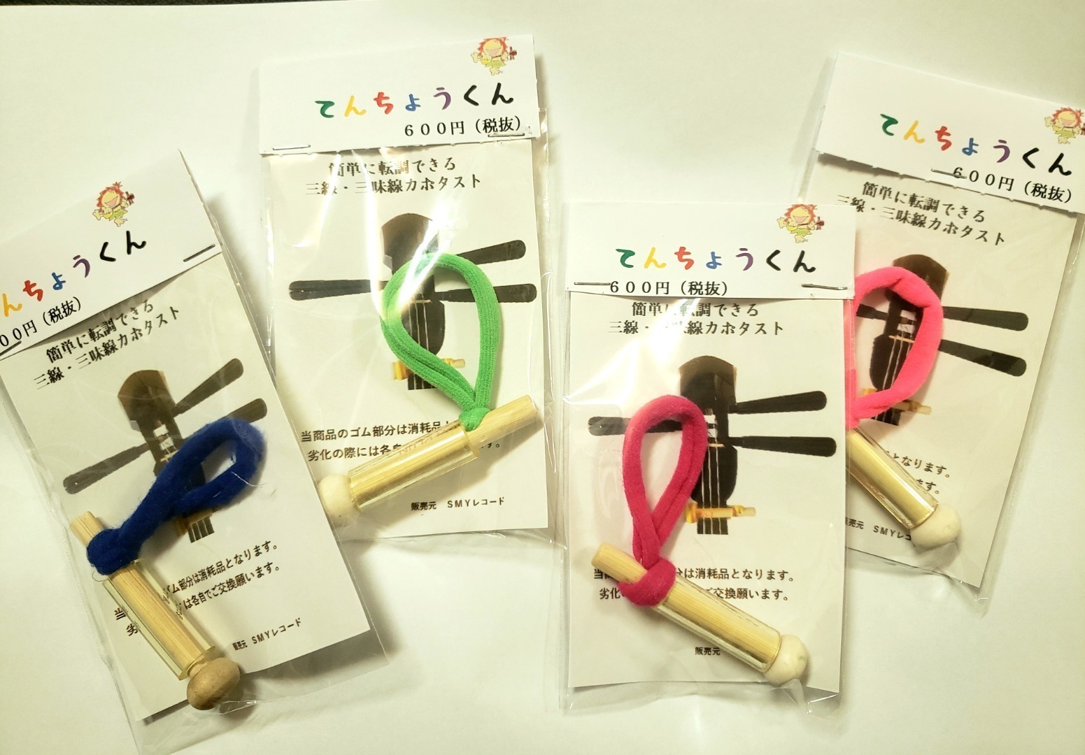 皆さまこんにちは。先日、にいじゅんSHOWにて、【てんちょうくん】を先行販売し、6つ売れました。【てんちょうくん】は、いわゆる三線・三味線用簡易カポタストの役割ですが、小指などが短くて”遠い尺”等に届かず綺麗な音色を出せないときにも、勘所をずらして的確に弾くこともできます。定価は600円(税別 送料別)です。お問い合わせ SMYレコード 090-7497-5359