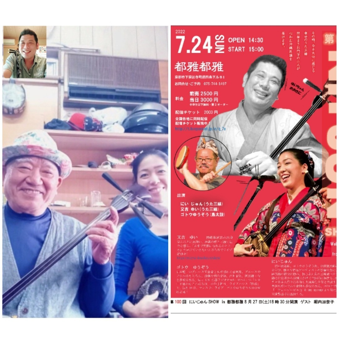 照屋まさお先生と、ゆいちゃんとオンライン交流大会でした😄 7月24日(日)15時~第99回にいじゅんSHOW in 都雅都雅 では、沖縄から又吉ゆいちゃんをゲストに迎えます。照屋まさお先生の故郷であります読谷にまつわる曲や、ヤンバルクイナの歌などの新曲も歌います。ぜひお早めにご予約をしておいてくださいね。よろしくお願いいたします🎵