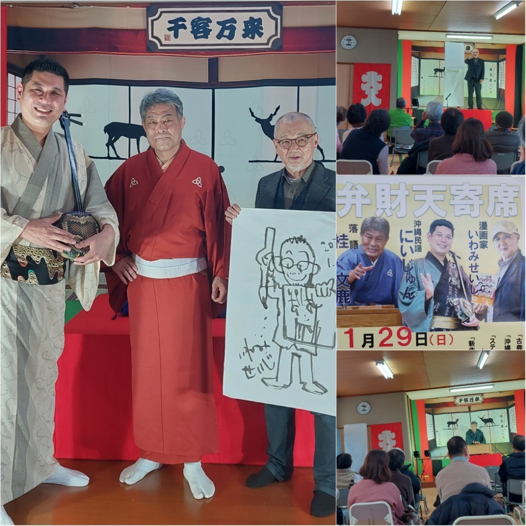 弁財天寄席で、桂文鹿さん(落語家)、いわみせいじ先生(漫画家)、にいじゅん(うた三線奏者)の演芸を届けました😊 三者三様の芸をフルにだしきった余韻は、今も心温かく達成感があります。『三人のユニット名を考えなあかんなぁ』と文鹿さん。今後も楽しみです!追伸 にいじゅん1stアルバム「ニィフェーデービル!」のジャケットは、いわみせいじ先生が描いてくださってます。本日もお客さんに2枚買うて頂けました。ありがとうございました!管理人