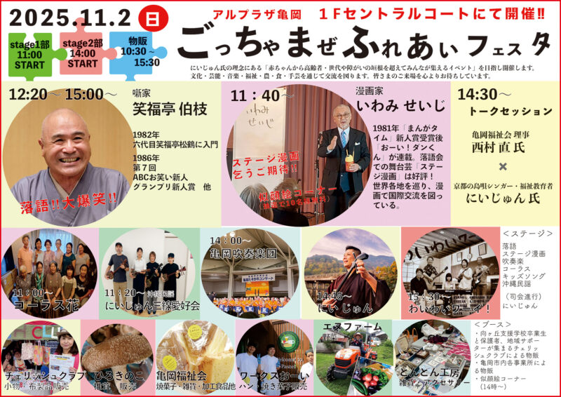 『地域を元気に』をテーマに福祉教育の専門家であるにいじゅん氏を演出監修に迎え、障がいのある方や高齢者含め、誰もが安心して参加できるイベントを11月2日(日)にアルプラザ亀岡 セントラルコートにて開催します。