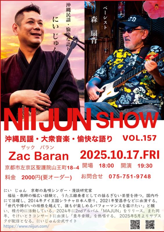 京都在の島唄シンガー・漫談研究家 にい じゅん兄との二人会 古典民謡は勿論 歌謡曲やフォークチューンも 秋の夜長 ZACBARANにて にいじゅん節を聴こう