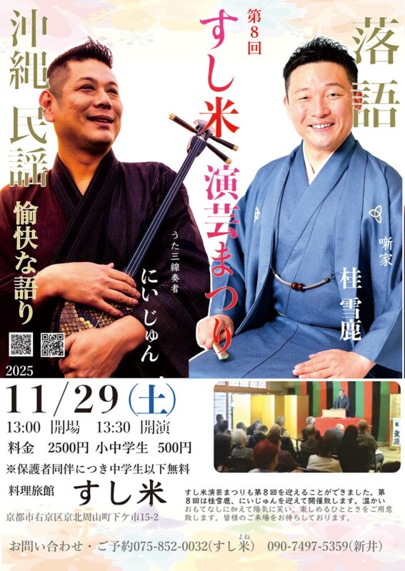 秋の京北(けいほく)へ、是非きてね。 老舗料理旅館すし米(すしよね)で、大いに笑いましょ 第8回すし米演芸会 2025年11月29日(土) 開場13:00 開演13:30 会場 料理旅館すし米 京都市右京区京北周山町下ケ市15ー2 料金2500円 小中学生500円 ※保護者同伴につき中学生以下無料 出演 にいじゅん、桂雪鹿 075-852-0032