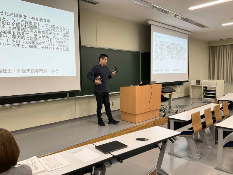 授業後、感想文を拝見すると、みんなそれぞれの考えをしっかりと持っているんだよね。てぃんさぐぬ花、艦砲ぬ喰ぇーぬくさ、豊年音頭を歌い伝え、僕の福祉教育としての経験則をみんなと交えながら進めることができたのではないかと思います。ありがとうございました。