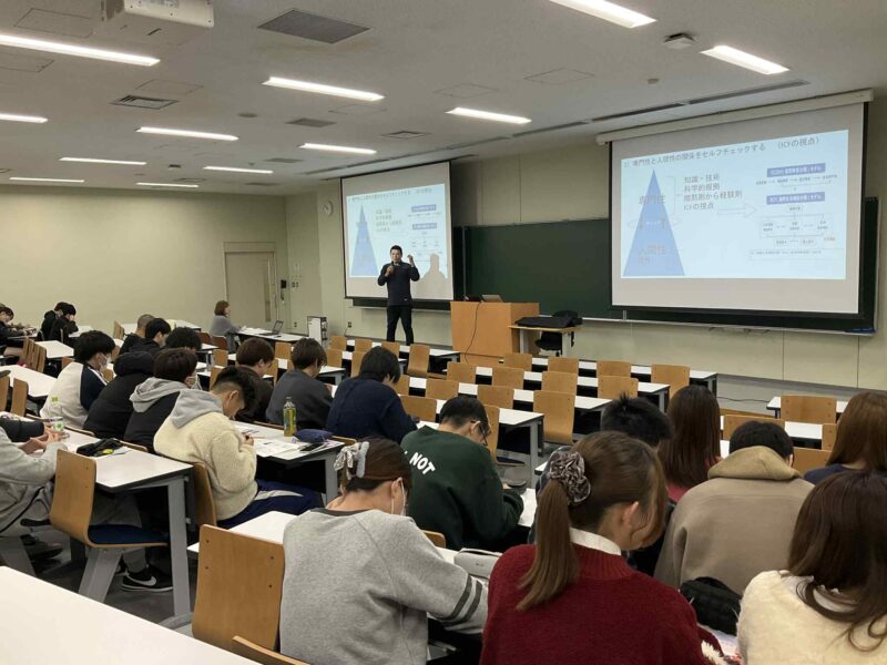 神戸学院大学で活躍されている学部長の佐野光彦教授のご厚意に招かれて毎年行っている授業に参加し、少しでも一緒に考えられる学びを皆さんと共有致しました。2026年初日の授業を学生たちは思い思いに過ごしていた子もいましたが、机間を練り歩きマイクを学生に渡して授業を進めてゆくと、みんな素直でなかには一生懸命聴いてくれてる学生もいました。(気持ちが向いてない子には日常生活の話を入れたりして)