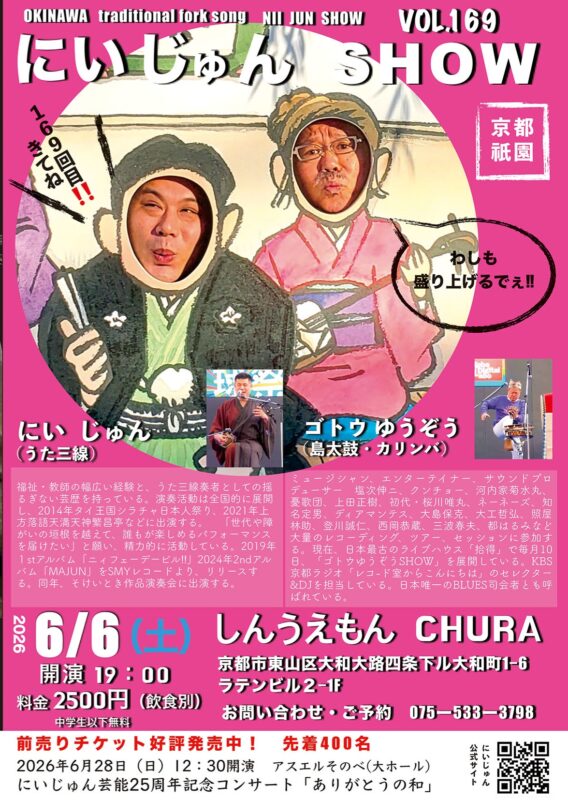 第163回にいじゅんSHOW!! しんうえもんCHURAにて開催致しました😊 尊敬するゴトウゆうぞう名人と共に、いつも愉快にライヴを開催できありがとうございます。 ニイジュン(2月・6月)は、しんうえもんCHURAでの開催となり、次回は6月6日(土)で、第169回目となります。皆様のお越しをお待ちしています。