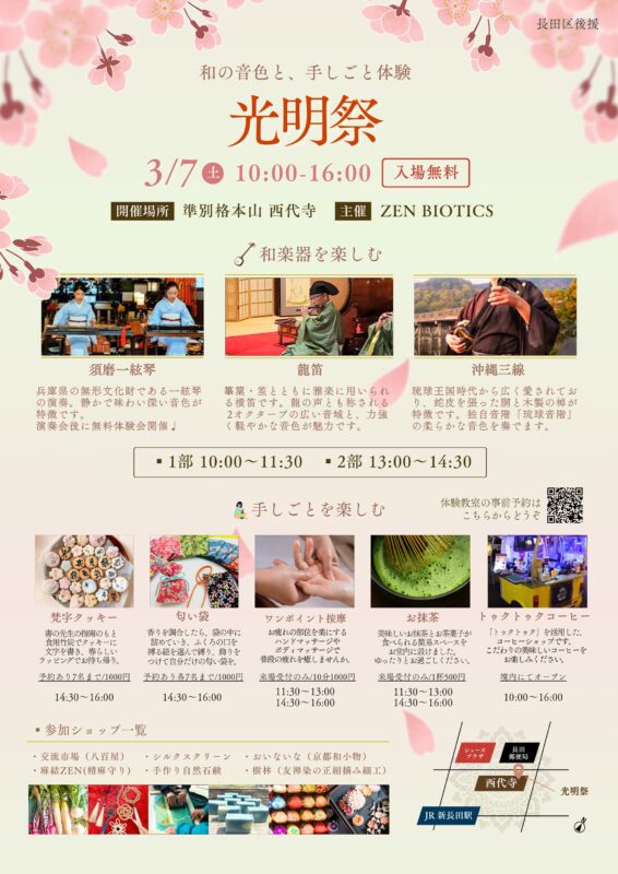 2026年3月7日(土)は、準別格本山 西代寺にて、光明祭に出演します。11時~、13時~の2回ステージです。お近くにお住まいの方は是非ともお越しくださいませ。JR新長田駅近くです😊