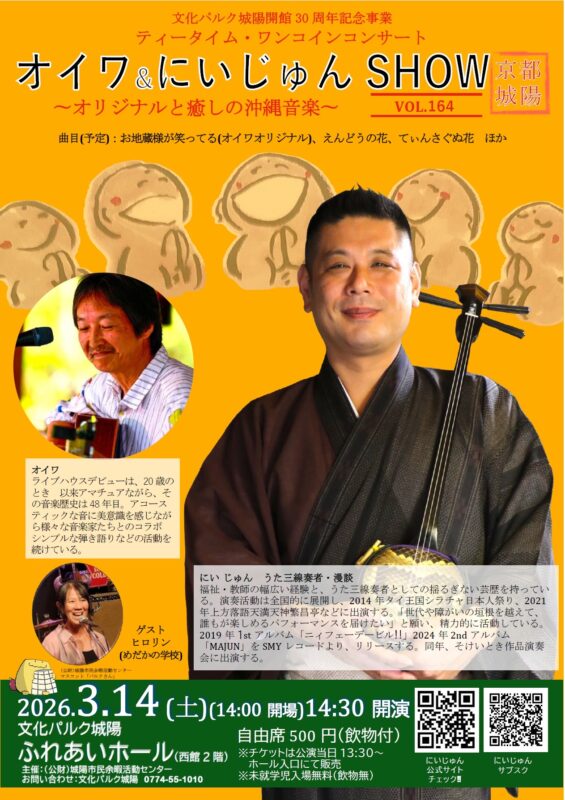 明日は城陽のホールにて【にいじゅんSHOW】が開催されます。『天国の父が、にいさんが歌い続けてくれてることを喜んでいるよ』と、でいご娘さんからお話を頂きました。僕にとっても大切な歌であり沖縄民謡を通じて平和の尊さを伝えてゆく為にも歌います。オイワさん、ヒロリンさんよろしくお願いいたします。