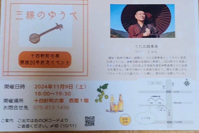 十四軒町の家20年記念イベントにて、にいじゅんをフィーチャーしたライブを展開致します。 すでに40名近い方の御予約があり満席とのこと。にいじゅんの福祉、教育、芸能、音楽に関わってきたことのごちゃ混ぜ人生観を、当日はステージで届けますので、どうぞ愉快に過ごして頂けたらと思います😊